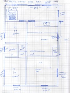 I had already gone through the house and done a rough scale diagram as I always do for renovation projects – this forces me to think through what needs to be done in more detail, and it also allows me to plan material purchases without having to frequently re-measure everything at the site. I keep a copy of this plan on my phone and can whip it out at any time during a trip to the building supply store.