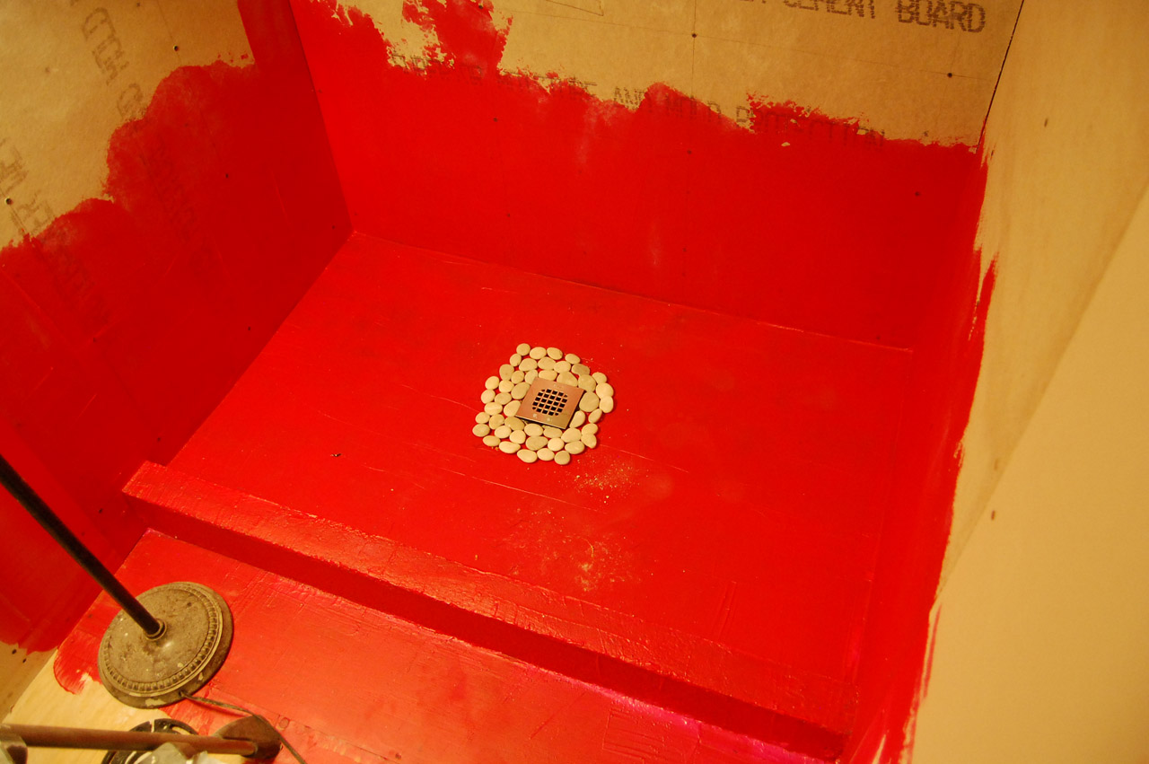 The sheet wasn’t going to work when I did an inset shelf in the master, so RedGuard it was – cool stuff. No water penetration that I can tell, and it’s been a month.