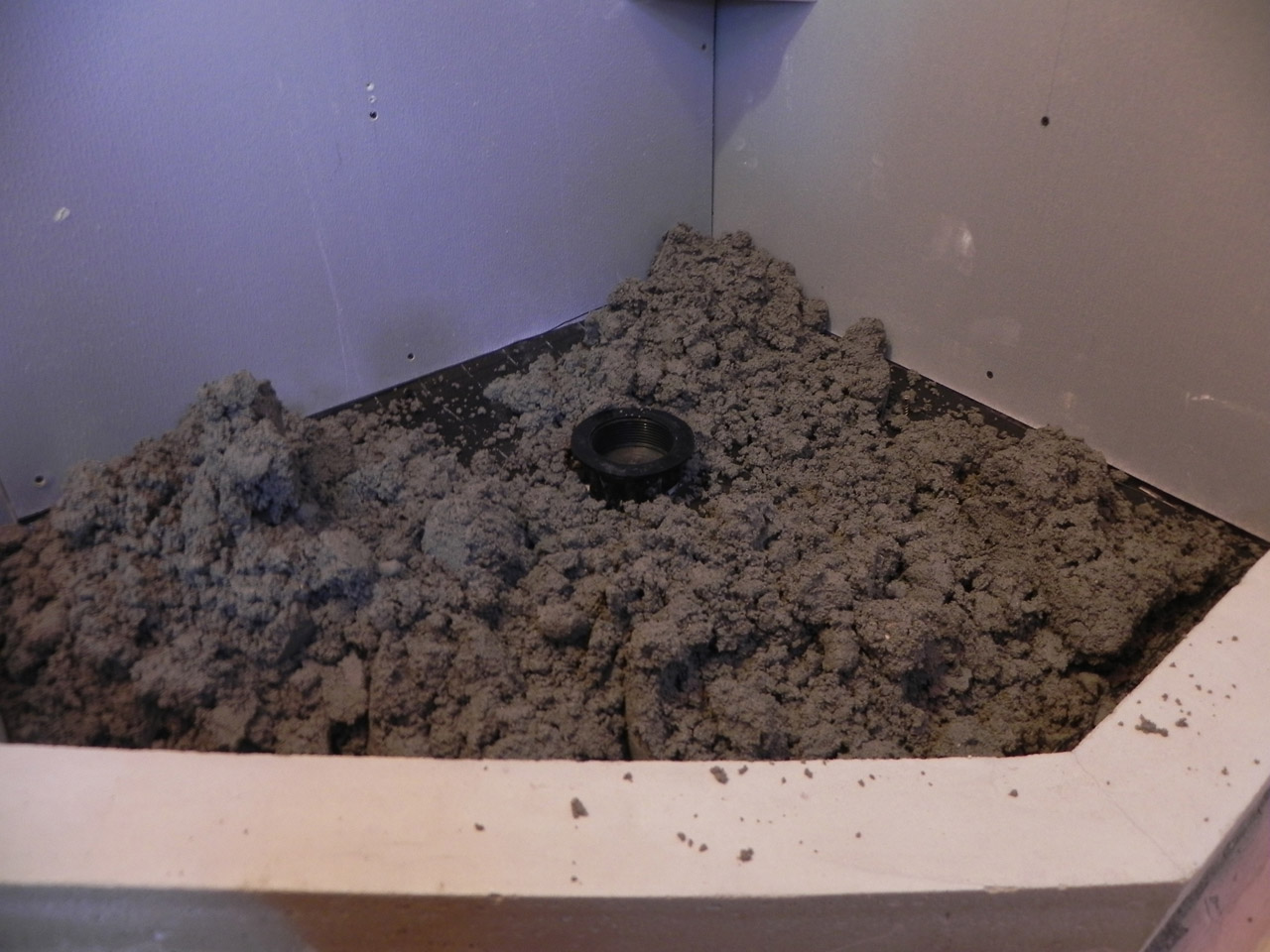 You’ll want a fairly dry (almost crumbly) mix of cement. But not regular concrete with gravel aggregate in it, here we use mason’s mix, which is just portland cement and sand – the same stuff used for brick mortar. Available right next to regular bags of concrete in the store. About three 80lb (36 kg) bags will do a 32″x48″ shower.