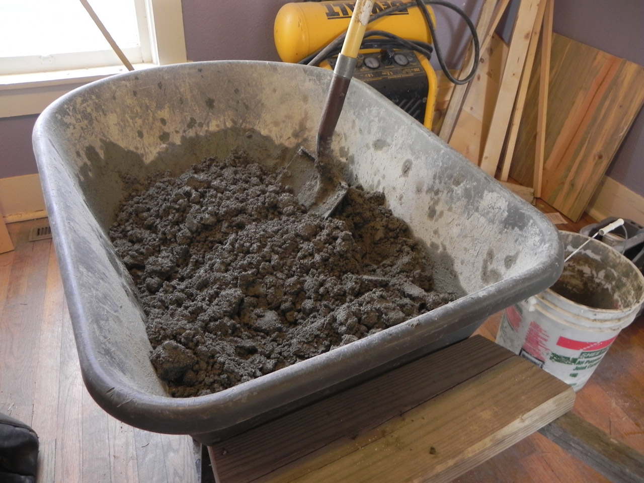 Mix the cement outside in a wheelbarrow one bag at a time, and carry it in to the house in a 5 gallon bucket. Dump it into your future shower, and it will look like this:
