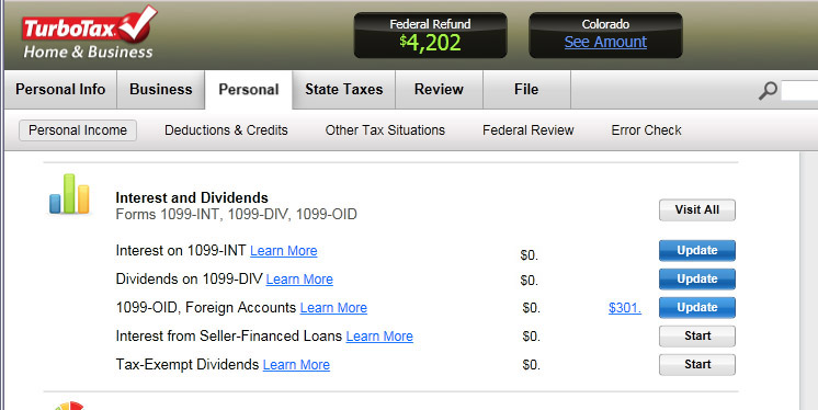 Once you have that number, you simply plug it into Schedule B on your tax form (which in turn goes into box 8a), or in Turbo Tax under “Personal Income->Interest and Dividends->1099. Here you’ll see my little $301 again.