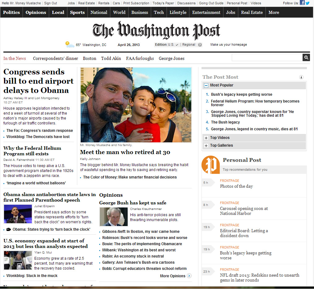 If you haven’t heard the news, it has been a pretty exciting weekend for Mustachianism. I had the rare treat of doing a little interview with the Washington Post, and it somehow got promoted to the front page of the paper’s online edition where it remained for the entire weekend. Even Ralph Nader retweeted it. This blog’s already ridiculous traffic doubled overnight, and so all of us old-timers would like to welcome the 50% of you who are brand-new!