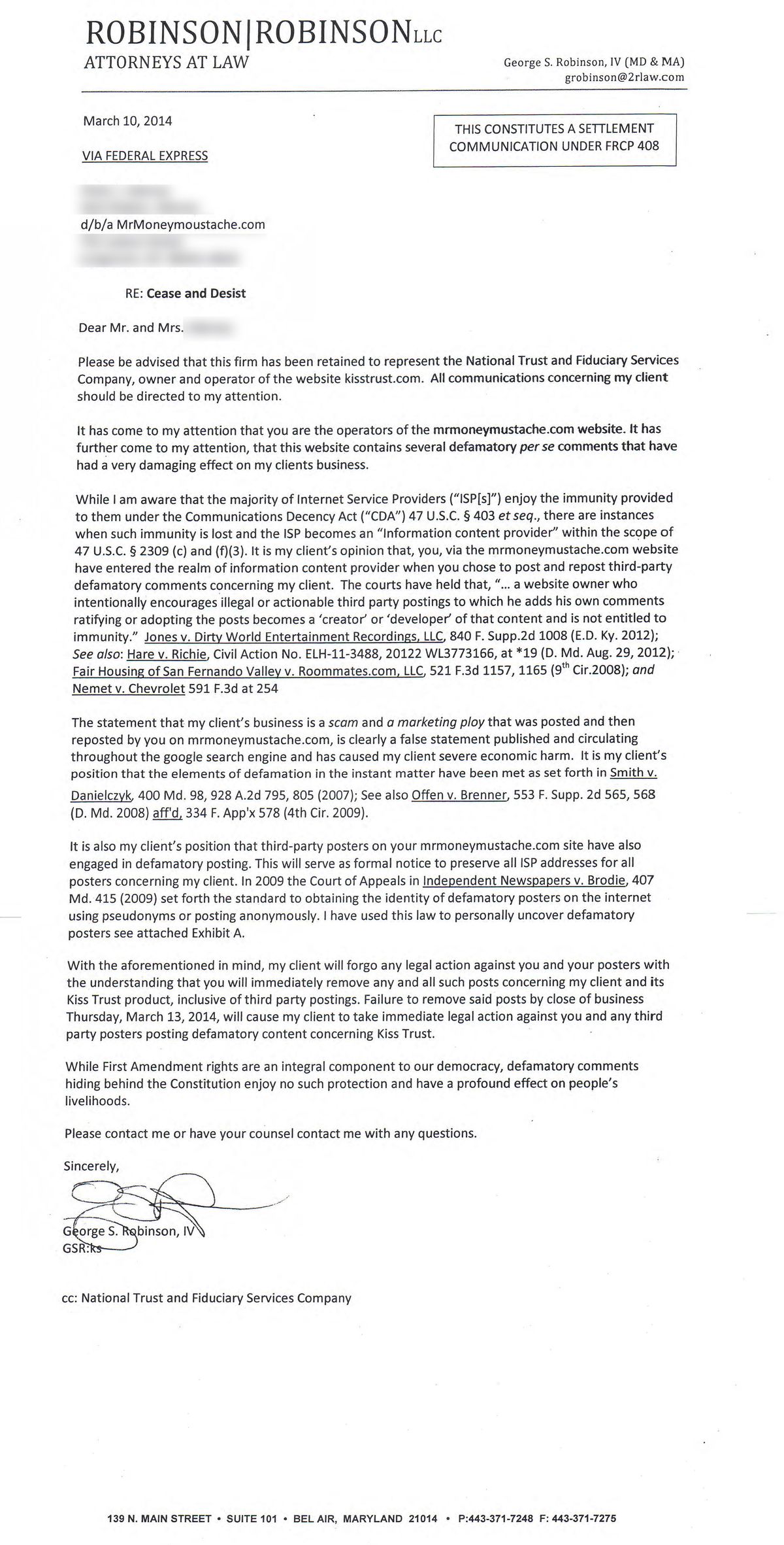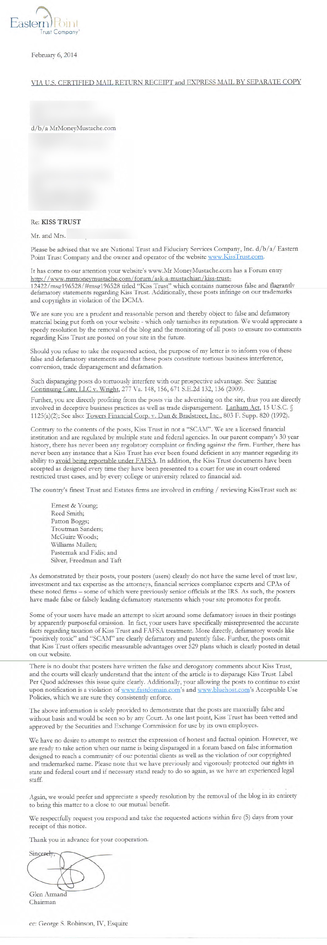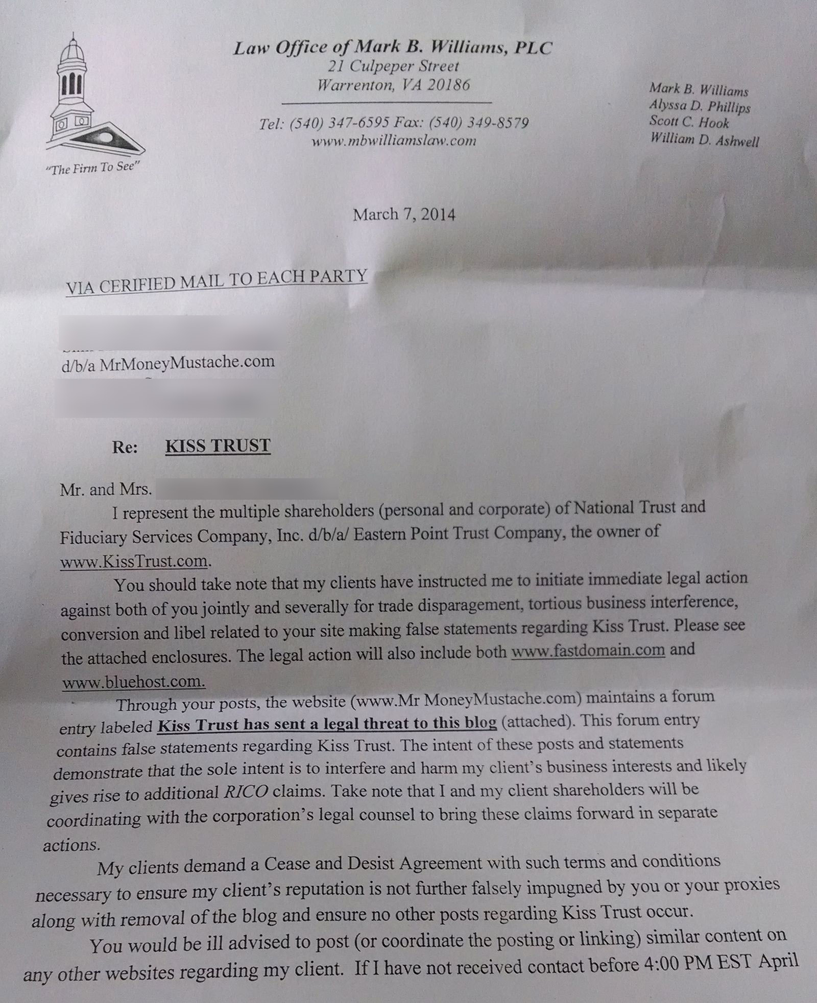 Update: After further advice from the MMM legal team, I can now safely share more details. The company is called Kiss Trust. The forum thread they are objecting to is this one right here. Their law firm is called “Law office of Mark B. Williams, PLC”, and here is a copy of the letter they sent me: