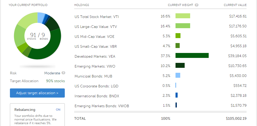 My $100k Betterment portfolio (which has since drifted up to $105k) is balanced across 10 Vanguard funds.