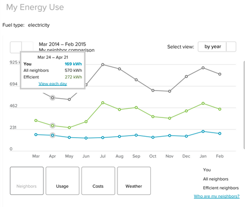 Further Inspiration: in response to this post, a reader named Mark sent me the annual power graph, for his 2200 SF house in Minneapolis. His electric company allows you to compare your consumption to that of your neighbors. Of course, the Mustachian line is the blue one way, way down below any of the other ones, quietly saving him loads of cash.