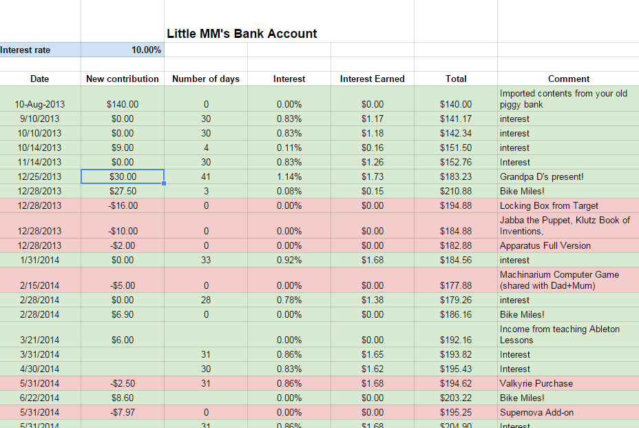This is where things get a bit unconventional. Instead of a physical piggy bank, my boy prefers to keep his money in the Bank of Mr. Money Mustache, a spreadsheet that contains every transaction he makes with money. To make a deposit, he just hands me some cash. To withdraw, he asks me for cash or has me buy something for him online.