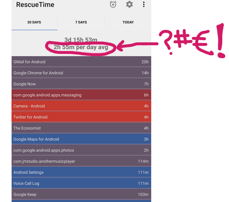 Then one unhappy evening my wife and I were having a pointless argument over which one of us had spent more time using their phone when they were supposed to be helping out with family life. We both decided to install the “RescueTime” app to track our own phone use, then attempt to be reasonable about that use over the next month. I was appalled by the results: