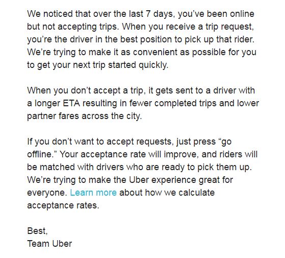 In fact, early in my driving career I learned how much the unpaid driving was hurting my profitability so I stopped accepting distant fares. The app quickly sent me this note: