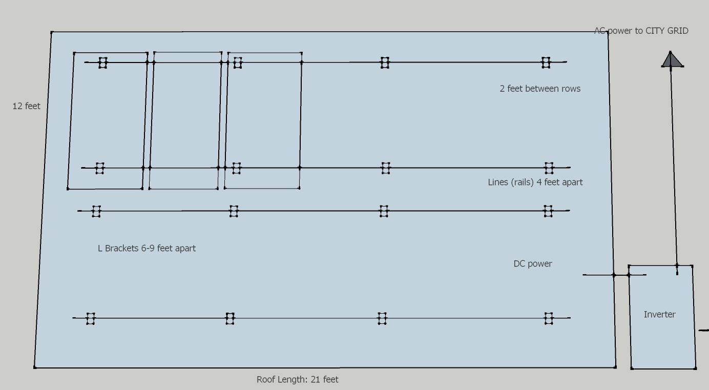 I needed two rails for each row of panels, and the rails get supported by “L”-shaped brackets bolted into the roof. So I ended up with this configuration: