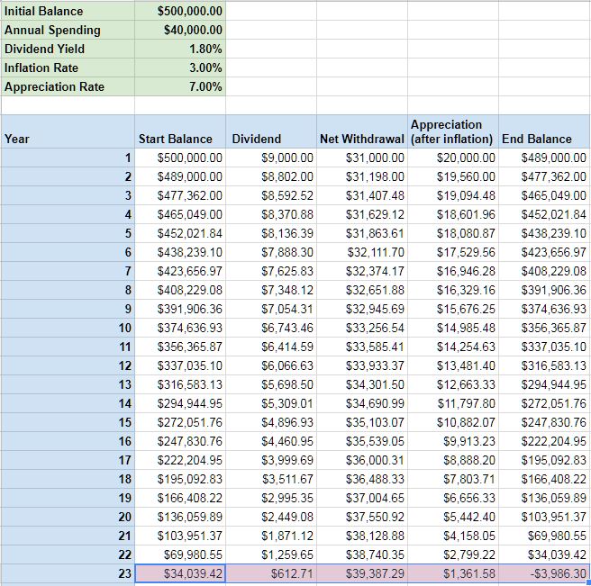 Here’s a quick spreadsheet with simple assumptions and 4% after-inflation stock market returns. In this situation the first 500 grand lasts about 23 years.