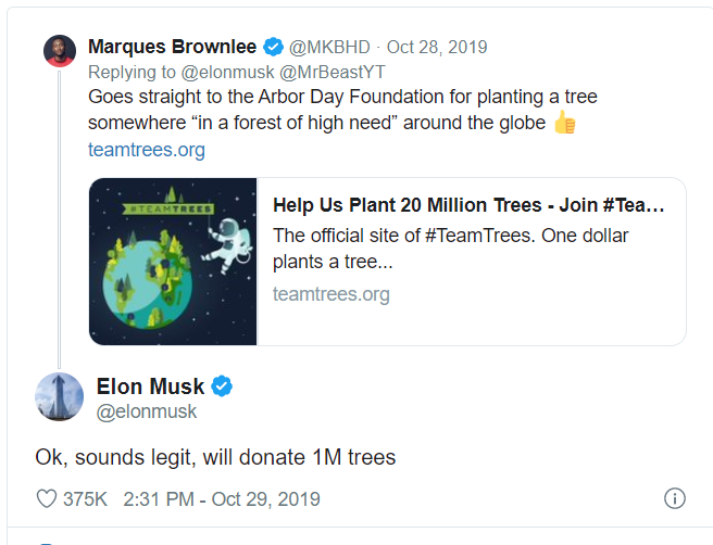 $1000 to plant one thousand trees, via the #teamtrees effort via the National Arbor Day Foundation. I credit some prominent YouTubers and Elon Musk for promoting this effort – so far it has resulted in over 20 million trees being funded, which is a lot (roughly equal to creating a dense forest as big as New York City)
