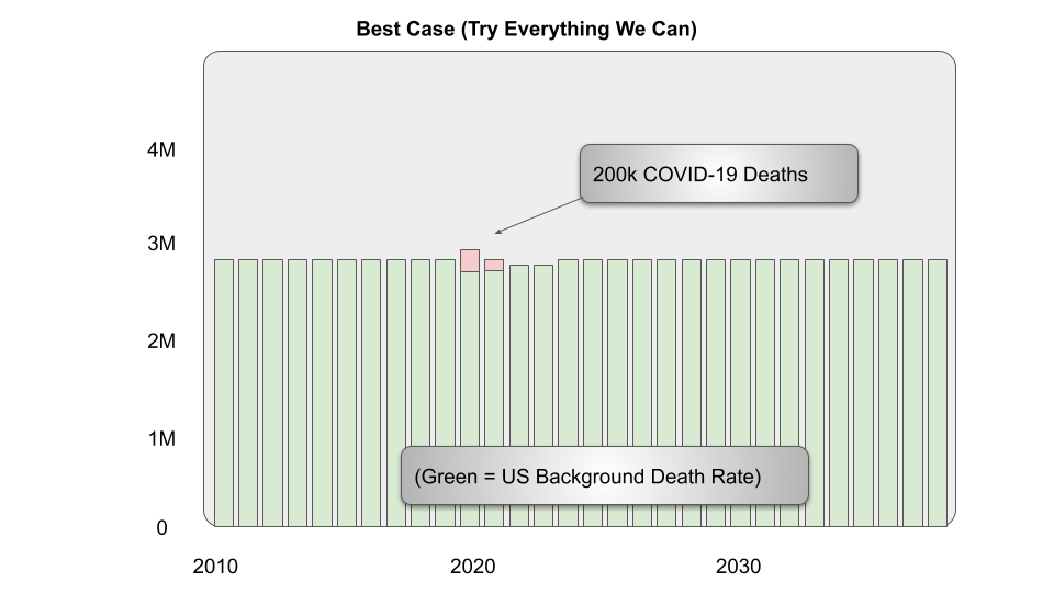 In the more compassionate case which we are currently following, we drastically reduce the amount of contact we have with each other for a few months, which cuts the number of deaths in the US down from 3-6 million, down to perhaps 200,000. In exchange, our economy shrinks by several trillion dollars (it was about 21 trillion in 2019) for a year or more.