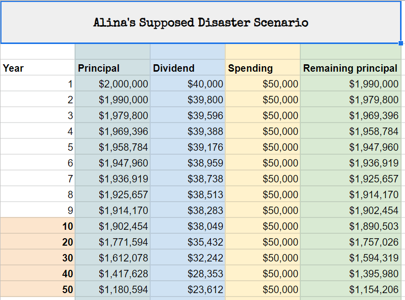 According to The 4% Rule, Alina’s nest egg will provide a pretty reliable income of roughly $80,000 per year for the rest of her life. Or to put it another way, her planned spending of $50k is only a 2.5% withdrawal rate from that 2 million. Since 4% is reasonably safe, 2.5% is a preposterously safe withdrawal rate.