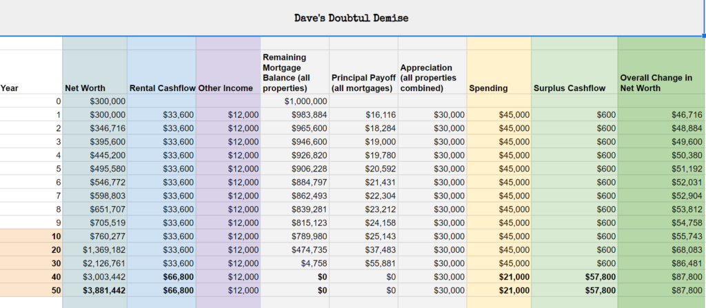 We threw Dave into the worst of situations, something far beyond just quitting his crappy day job and arguably impossible. Yet not only does his cashflow continue to increase, but  his net worth skyrockets by about $50,000 per year, ending up at almost $4 million dollars (inflation-adjusted too) by the time he kicks the bucket at 90 years old.
