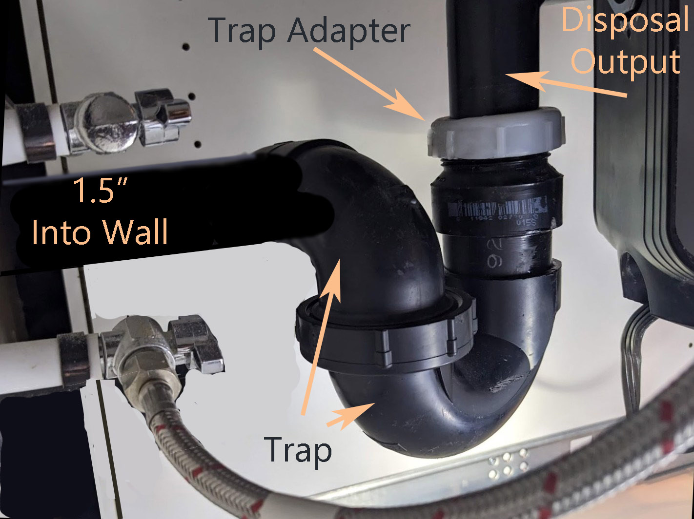 - Loose-fit a trap adapter to the disposal output and then figure out what direction to angle your trap to create the simplest/tidiest run to the wall pipe
