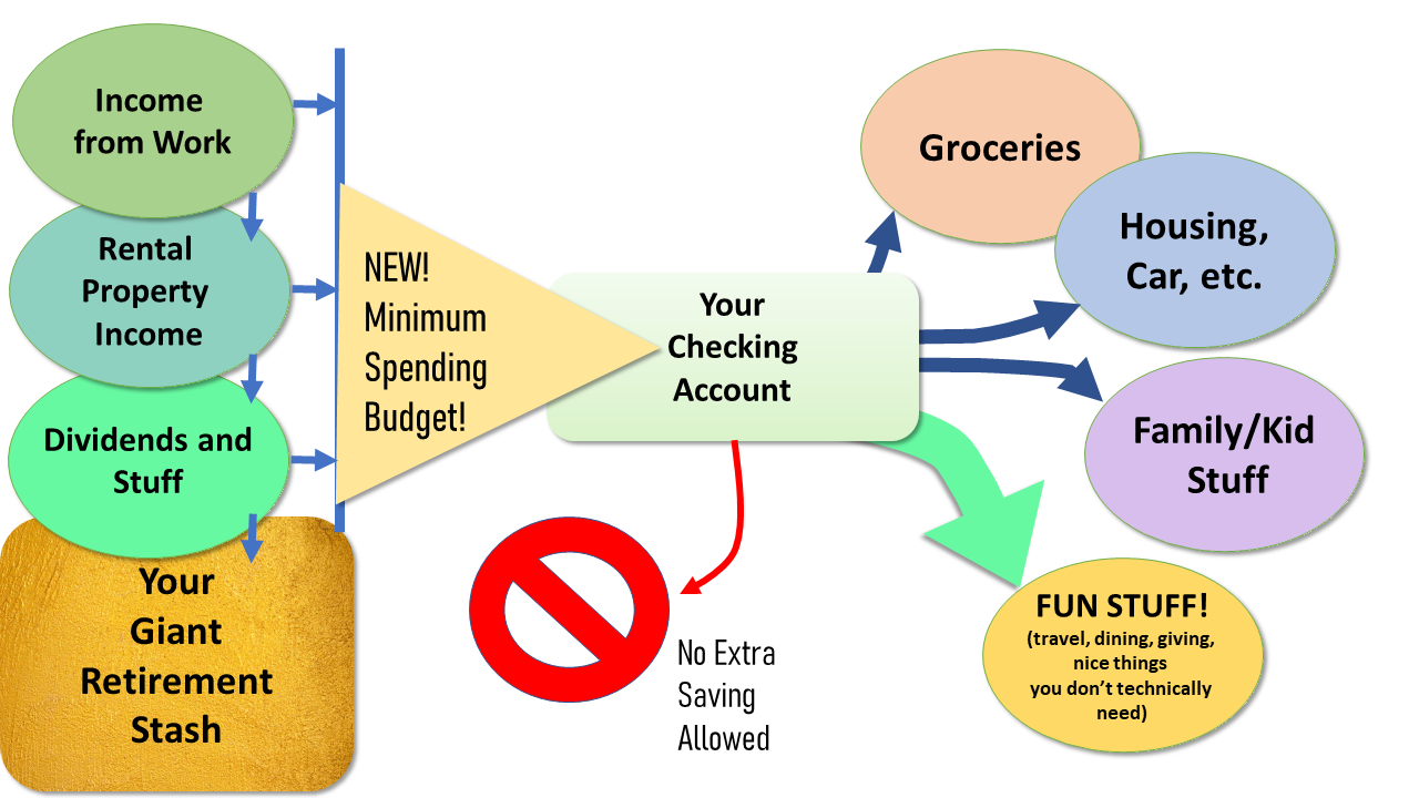 In this situation, you can still leave your dividends reinvesting but still give yourself a bigger, no-saving-allowed budget to get some practice being more relaxed and generous. The real point here is to just stop sweating the details so you can have more fun.