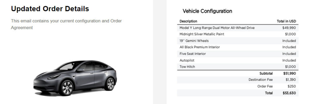 - Model Y plus options and Tesla fees: $53,630