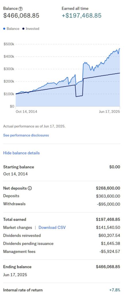 A recent screenshot of my “performance” tab. Note that I took out $95k for a charitable donation in late 2020, then replaced exactly the same number of shares when I had the cash in September 2021 (by that time the same shares cost me $135k – another great illustration of why you should always stay invested!)