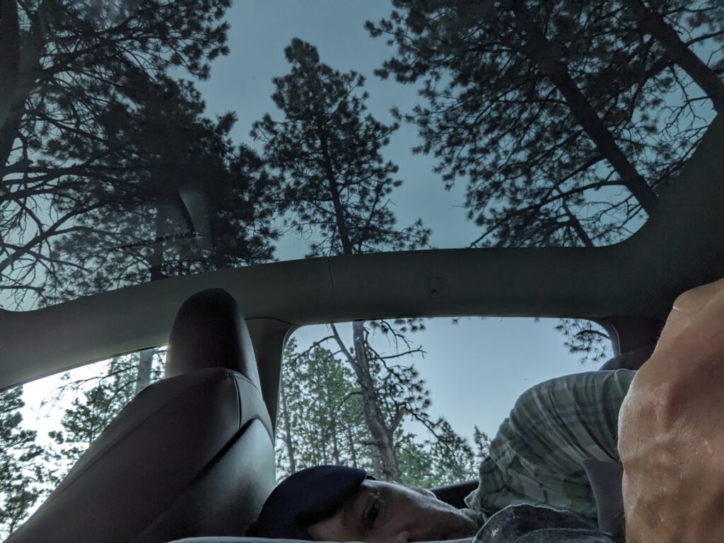 I was hoping this car would be okay for sleeping in a pinch, but it turns out it is more than okay – it’s fantastic. Because of this, I have already spent about 30 nights camped out in all sorts of locales, sleeping in the cozy, flat, 6-foot long passenger and cargo area (the rear seats fold totally flat). And the glass roof makes for a very scenic moon viewing as you fall asleep, and nice views of the trees when you wake up in the morning.