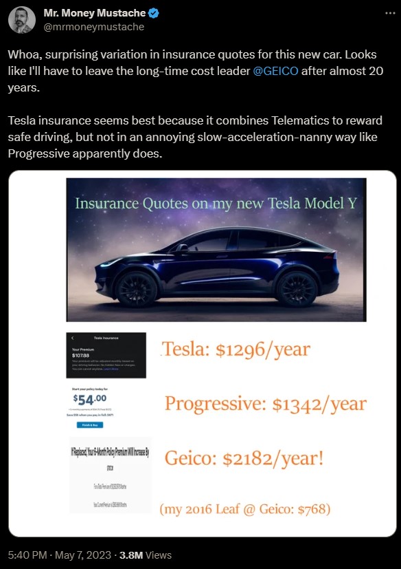 For the past fifteen years I had been using Geico insurance, which offered the best price on insuring my fleet of old, cheap cars. But when I got a quote for the new Tesla, Geico was no longer competitive. So I switched to Tesla Insurance.