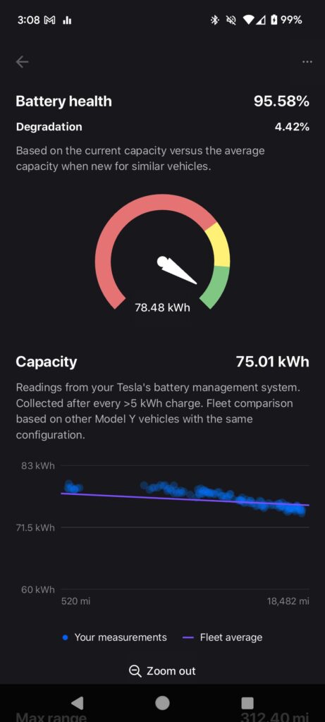 So far, so good as I’ve had only a few percent fading after almost two years of heavy driving. But more importantly, this first 5% is a known phenomenon with Lithium batteries. In fact, the battery is marketed as having a 75 kWh capacity so we’re only reaching that stage now. After this, they tend to stabilize and age even more slowly. According to the Tessie fleet average, the average customer still has about 87% capacity remaining even after 100,000 miles.